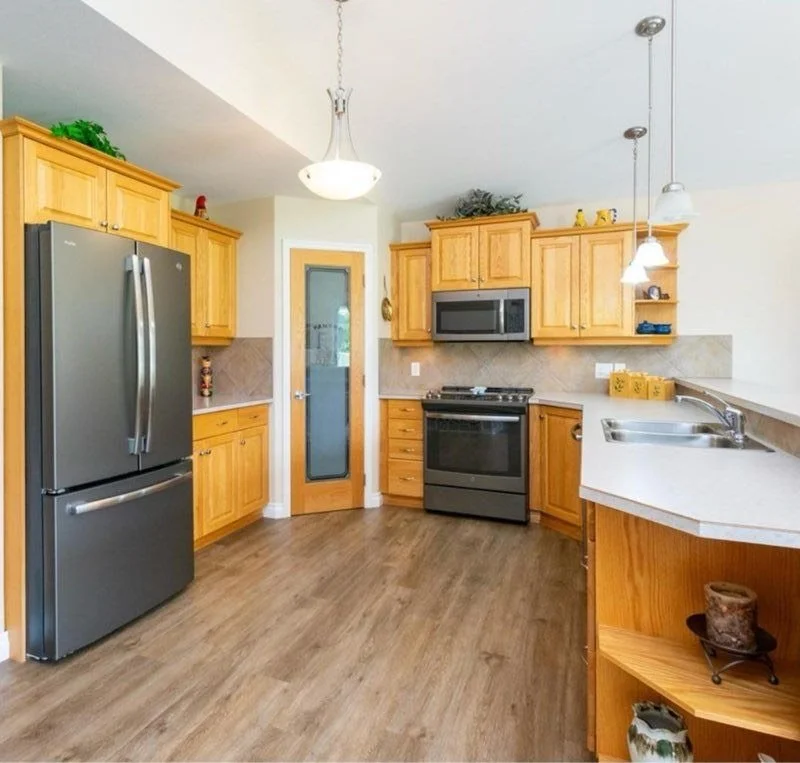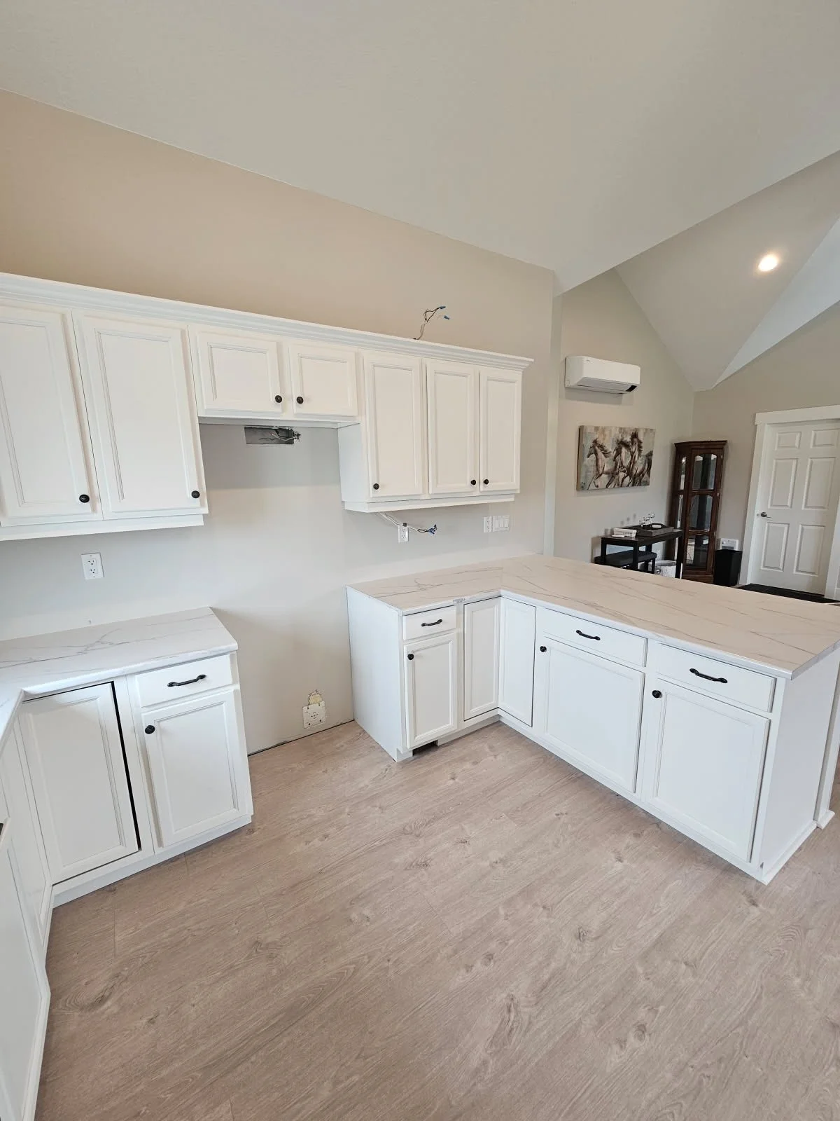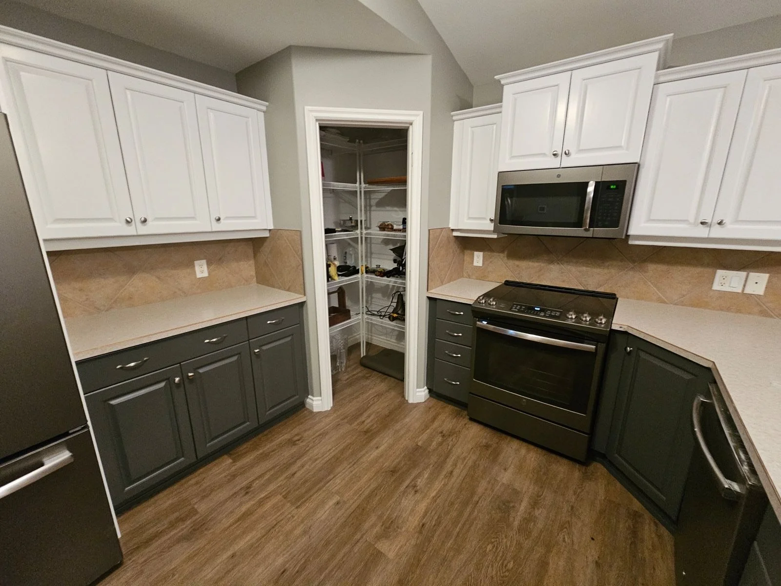 Maple cabinets painted to colour Simply White with Renner cabinet paint.