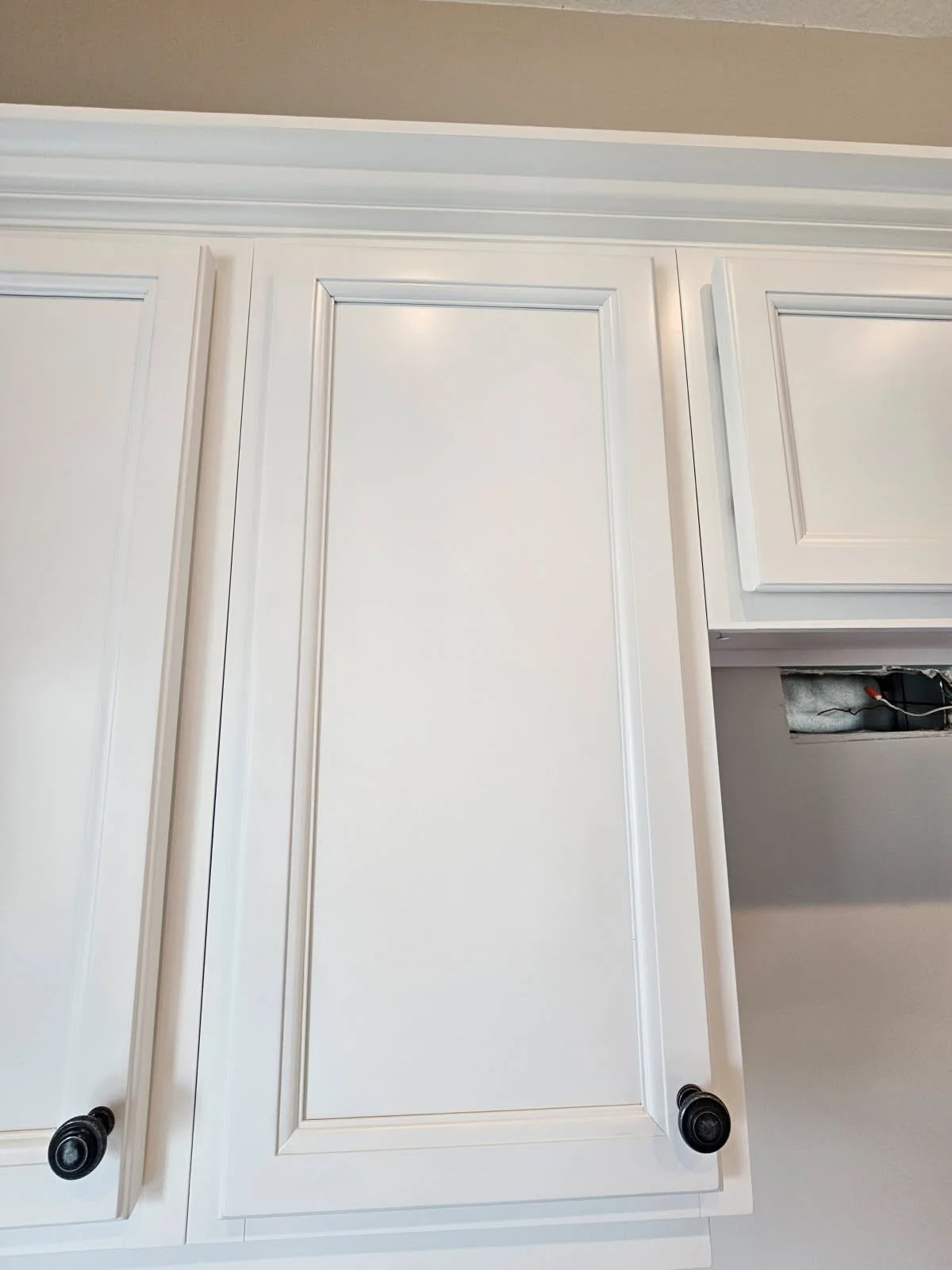 Maple Cabinets painted to the colour Chantilly Lace with Renner 2K cabinet paint for ultimate durability.